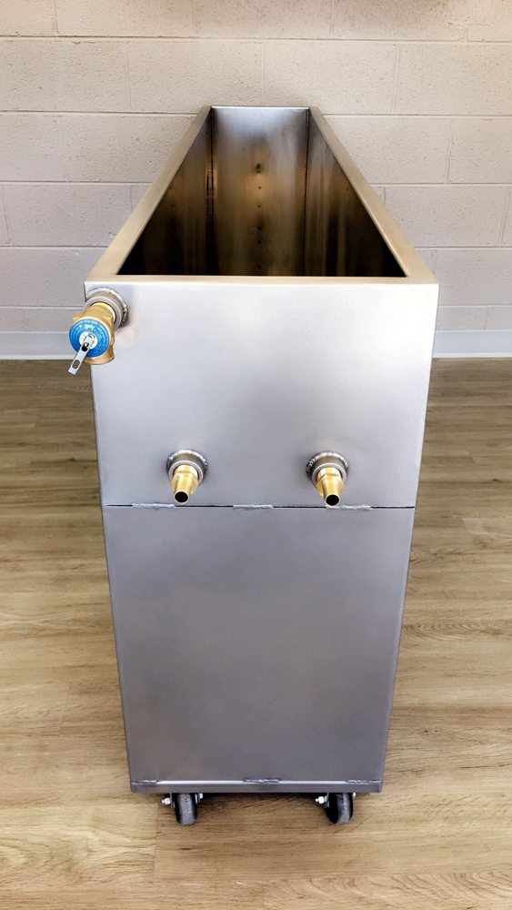 A water-jacketed tank is a water-filled casing surrounding a tank which has intake and outlet vents that allow water to be pumped through pressurized water tubes and circulated. This allows for precise temperature control so that you can heat or cool something to an exact temperature. For instance, chefs use stainless steel water-jacketed tanks to melt chocolate!